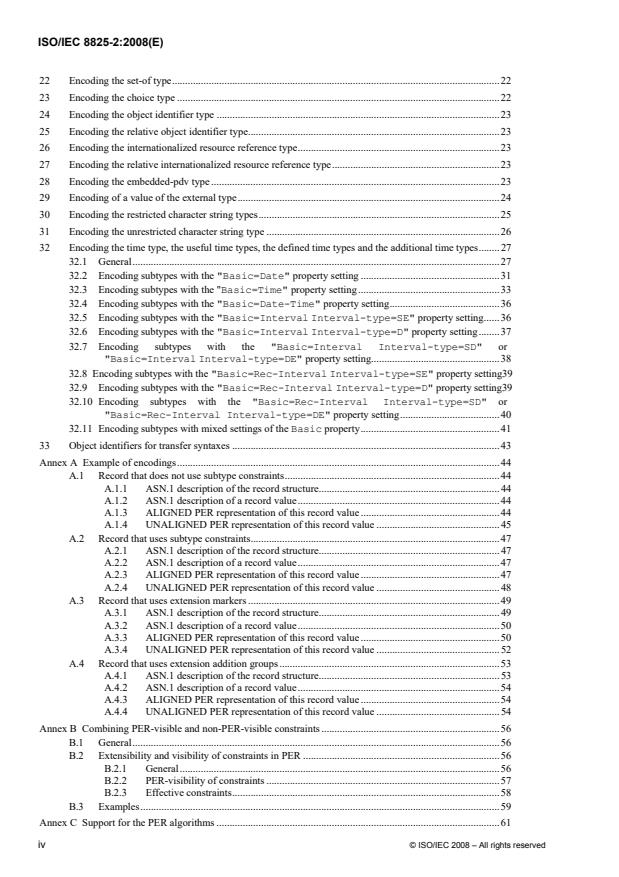 ISO/IEC 8825-2:2008 is a standard published by the International Organization for Standardization (ISO). Its full title is "Information technology — ASN.1 encoding rules: Specification of Packed Encoding Rules (PER) — Part 2:". This standard covers: ISO/IEC 8825-2:2008 specifies a set of Packed Encoding Rules that can be used to derive a transfer syntax for values of types defined in ISO/IEC 8824-1. These Packed Encoding Rules can also be applied for decoding such a transfer syntax in order to identify the data values being transferred. The encoding rules specified in ISO/IEC 8825-2:2008: are used at the time of communication; are intended for use in circumstances where minimizing the size of the representation of values is the major concern in the choice of encoding rules; allow the extension of an abstract syntax by addition of extra values, preserving the encodings of the existing values, for all forms of extension described in ISO/IEC 8824-1; can be modified in accordance with the provisions of ISO/IEC 8825-6.