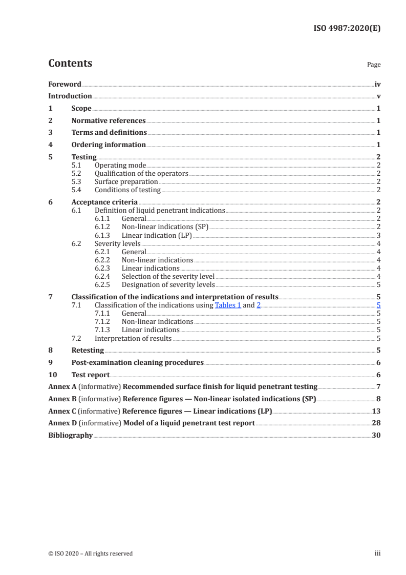 Keywords: ISO 4987:2020, liquid penetrant testing, steel and iron castings, NDT, penetrant indications, severity levels, surface preparation, ISO 3452-1, ISO 9712.