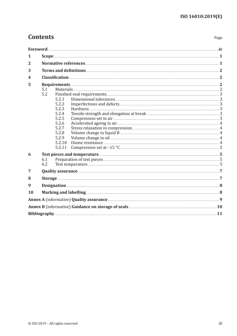 ISO 16010:2019 is a standard published by the International Organization for Standardization (ISO). Its full title is "Elastomeric seals — Material requirements for seals used in pipes and fittings carrying gaseous fuels and hydrocarbon fluids". This standard covers: This document specifies requirements for elastomeric materials used in seals for supply pipes and fittings, ancillaries and valves at operating temperatures in general from ?5 °C up to 50 °C and in special cases from ?15 °C up to 50 °C, for the following: a) general applications (see Table 4, type G series): — gaseous fuel [manufactured, natural and liquefied petroleum gas (LPG) in the gaseous phase], — hydrocarbon fluids with an aromatic content up to 30 % (by volume), including LPG in the liquid phase; b) special applications (see Table 4, type H): — materials suitable for carrying gaseous fuels containing gas condensates and hydrocarbon fluids of unrestricted aromatic content. General requirements for finished joint seals are also given; any additional requirements called for by the particular application are specified in the relevant product standards, taking into account that the performance of pipe joints is a function of the seal material properties, seal geometry and pipe joint design. This document is used where appropriate with product standards which specify performance requirements for joints. This document is applicable to joint seals for all pipeline materials, including iron, steel, copper and plastics. In the case of composite sealing rings, the requirements in 5.2.8 and 5.2.9 apply only when the materials used for any elastomeric parts come into contact with gaseous fuel or hydrocarbon fluid. Elongation at break, tensile strength, compression set and stress relaxation requirements for materials of hardness classes 80 and 90 apply only when they constitute that part of the seal which participates directly in the sealing function or contributes directly to long-term stability. This document is not applicable to the following: — seals made from cellular materials; — seals with enclosed voids as part of their design; — seals required to be resistant to flame or to thermal stress; — seals which contain splices joining pre-vulcanized profile ends.