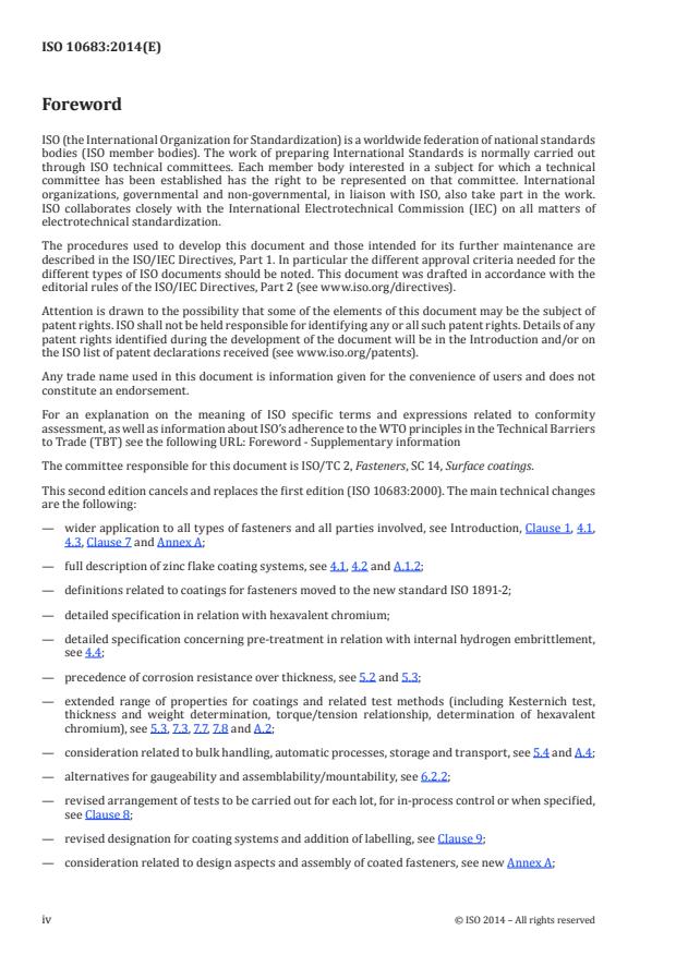 ISO 10683:2014 specifies requirements for non-electrolytically applied zinc flake coatings for steel fasteners. It applies to coatings: with or without hexavalent chromium; with or without top coat; with or without lubricant (integral lubricant and/or subsequently added lubricant). It applies to bolts, screws, studs and nuts with ISO metric thread, to fasteners with non-ISO metric thread, and to non-threaded fasteners such as washers, pins, clips, etc. ISO 10683:2014 does not specify requirements for such fastener properties as weldability or paintability. It does not apply to mechanically applied zinc coatings.