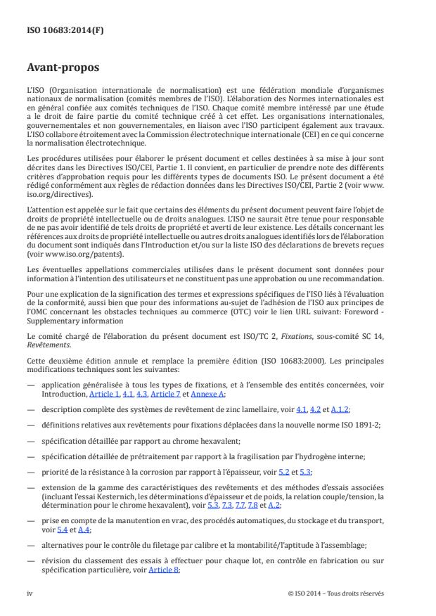 L'ISO 10683:2014 spécifie les exigences relatives aux revêtements non électrolytiques de zinc lamellaire pour les fixations en acier. Elle s'applique aux revêtements: avec ou sans chrome hexavalent; avec ou sans finition «top coat»; avec ou sans lubrifiant (lubrifiant intégré et/ou lubrifiant additionnel). Elle s'applique aux vis, goujons, tiges filetées et écrous à filetage métrique ISO, aux fixations à filetage non métrique ISO et aux fixations non filetées telles que les rondelles, les goupilles, les clips, etc. L'ISO 10683:2014 ne spécifie aucune exigence pour les caractéristiques des fixations telles que la soudabilité ou l'aptitude à la peinture. Elle ne s'applique pas aux revêtements de zinc appliqués mécaniquement.