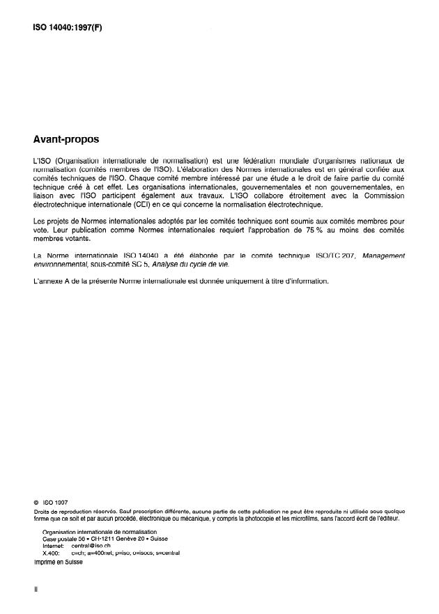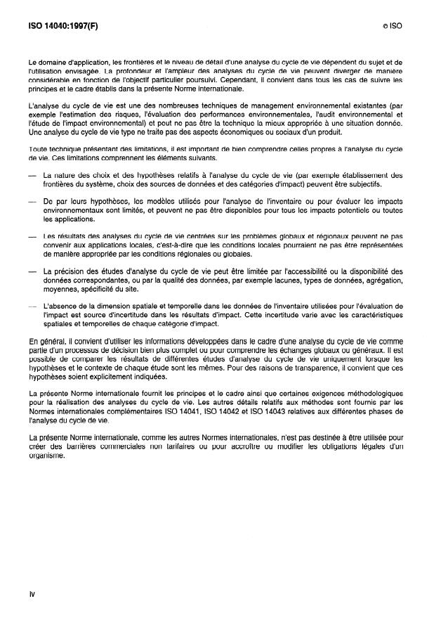 ISO 14040:1997 is a standard published by the International Organization for Standardization (ISO). Its full title is "Environmental management — Life cycle assessment — Principles and framework". This standard covers: La présente Norme internationale spécifie le cadre et les principes généraux ainsi que les exigences générales pour la réalisation d'analyses du cycle de vie et la communication sur ces études. La présente Norme internationale ne décrit pas dans le détail la technique d'analyse du cycle de vie.