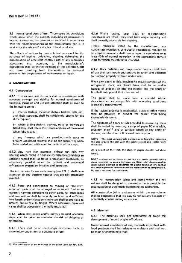 Provides guidance in the selection and use of materials and specifies the marking and performance requirements for commercial refrigerated cabinets intended for the sale and/or display of food products. Is to be read in conjunction with ISO 5160/2 which covers in detail the requirements for cabinets of specific type or intended for particular applications.