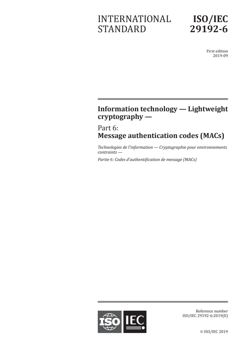 ISO/IEC 29192-6:2019 - Information technology — Lightweight cryptography — Part 6: Message authentication codes (MACs) Released:9/18/2019
