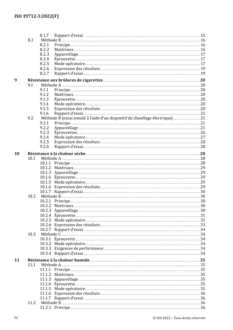 - Resistance to cigarette burns - Method A (actual cigarette) and Method B (simulated electric heater) for assessing surface damage and recovery.