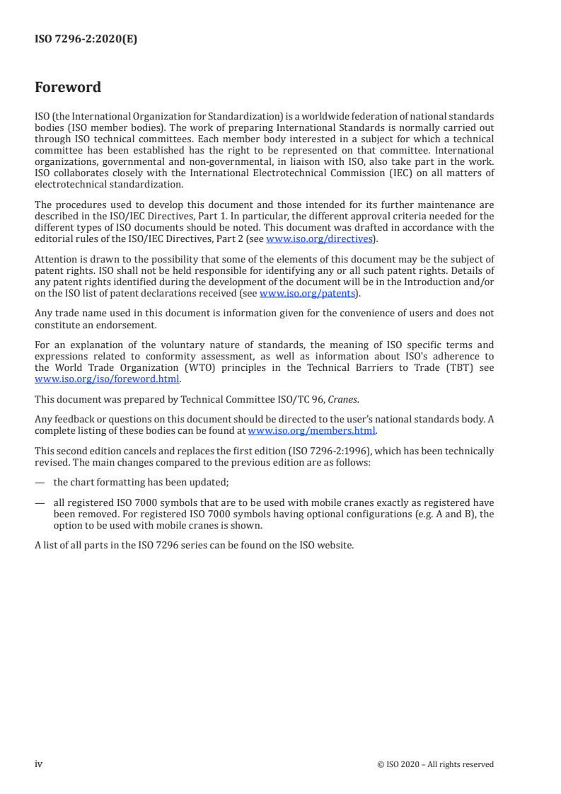 ISO 7296-2:2020 is a standard published by the International Organization for Standardization (ISO). Its full title is "Cranes — Graphical symbols — Part 2: Mobile cranes". This standard covers: This document establishes graphical symbols for use on operator controls and other displays on mobile cranes as defined in ISO 4306‑2.