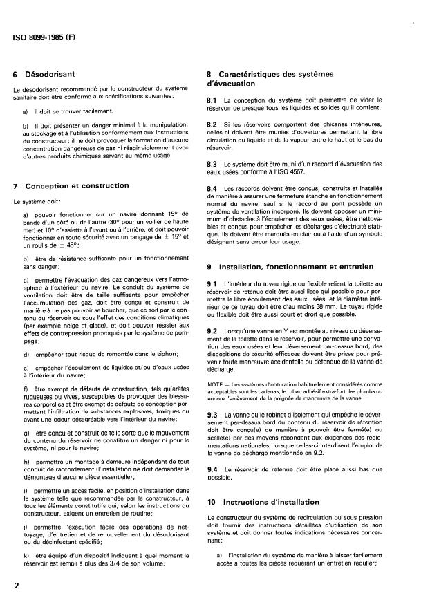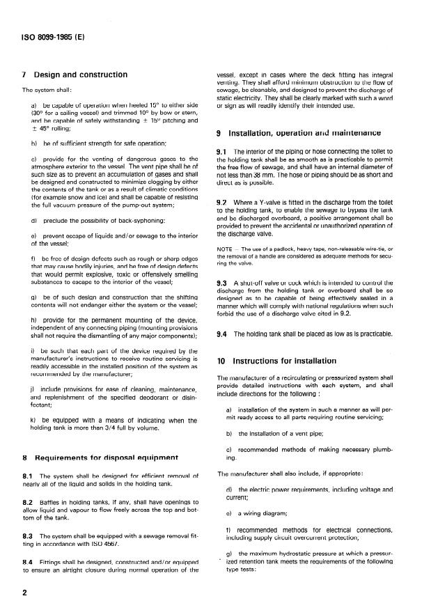 ISO 8099:1985 is a standard published by the International Organization for Standardization (ISO). Its full title is "Small craft — Toilet retention and recirculating systems for the treatment of toilet waste". This standard covers: Small craft — Toilet retention and recirculating systems for the treatment of toilet waste