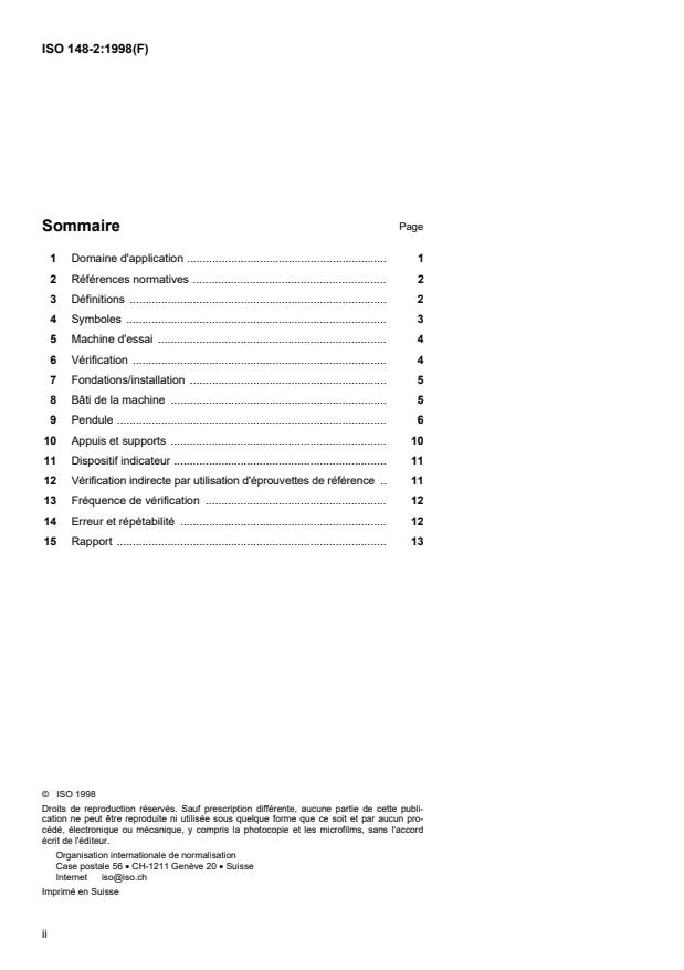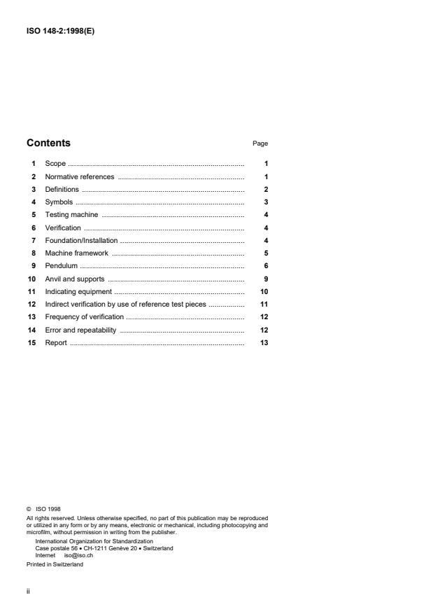 ISO 148-2:1998 is a standard published by the International Organization for Standardization (ISO). Its full title is "Metallic materials — Charpy pendulum impact test — Part 2: Verification of test machines". This standard covers: Metallic materials — Charpy pendulum impact test — Part 2: Verification of test machines