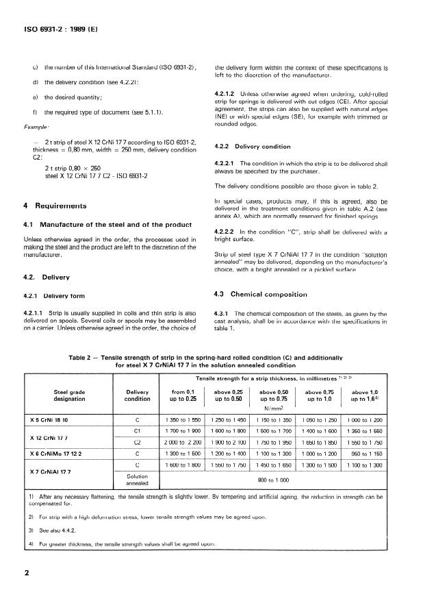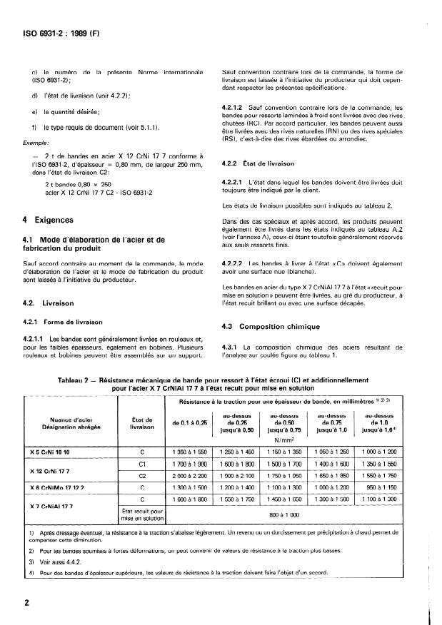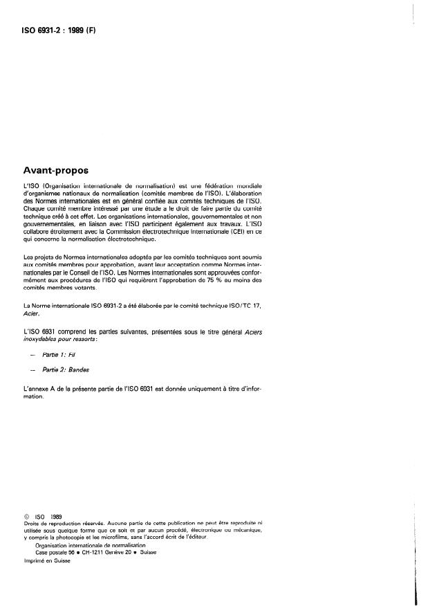 ISO 6931-2:1989 is a standard published by the International Organization for Standardization (ISO). Its full title is "Stainless steels for springs — Part 2: Strip". This standard covers: Applies to the steel grades listed in table 1, which are generally used in the work-hardened condition in the form of strip up to about 1,6 mm in thickness. The produced springs are exposed to corrosive effects and sometimes slightly increased temperatures. In addition to this part of ISO 6931, the general technical delivery requirements of ISO 404 are applicable. Annex A gives additional information.