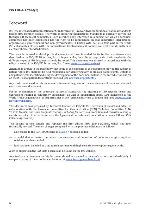ISO 11844-1:2020 is a standard published by the International Organization for Standardization (ISO). Its full title is "Corrosion of metals and alloys — Classification of low corrosivity of indoor atmospheres — Part 1: Determination and estimation of indoor corrosivity". This standard covers: This document establishes a classification of low corrosivity of indoor atmospheres. It specifies the reference metals for which a corrosion attack after a defined exposure period is used for determining corrosivity categories of indoor atmospheres of low corrosivity. It defines corrosivity categories of indoor atmospheres according to corrosion attack on standard specimens. It indicates important parameters of indoor atmospheres that can serve as a basis for an estimation of indoor corrosivity. The selection of a method for the determination of corrosion attack, description of standard specimens, exposure conditions and evaluation are given in ISO 11844-2. The measurement of environmental parameters affecting indoor corrosivity is given in ISO 11844-3.