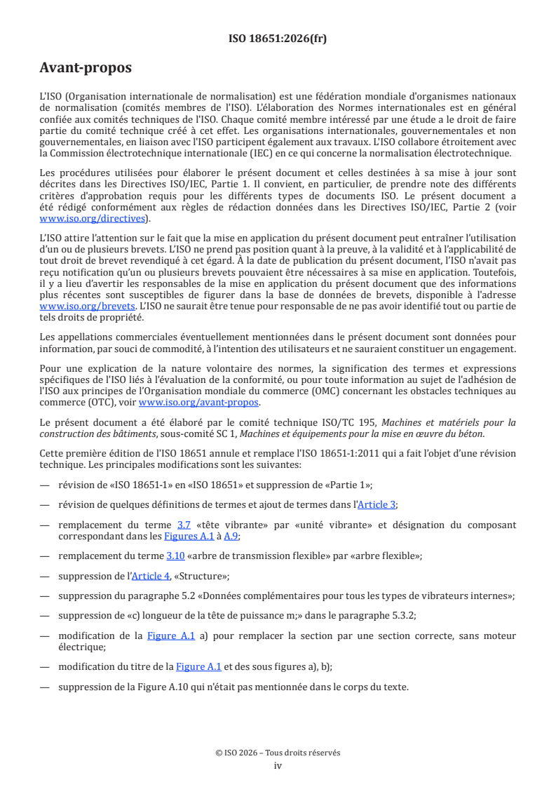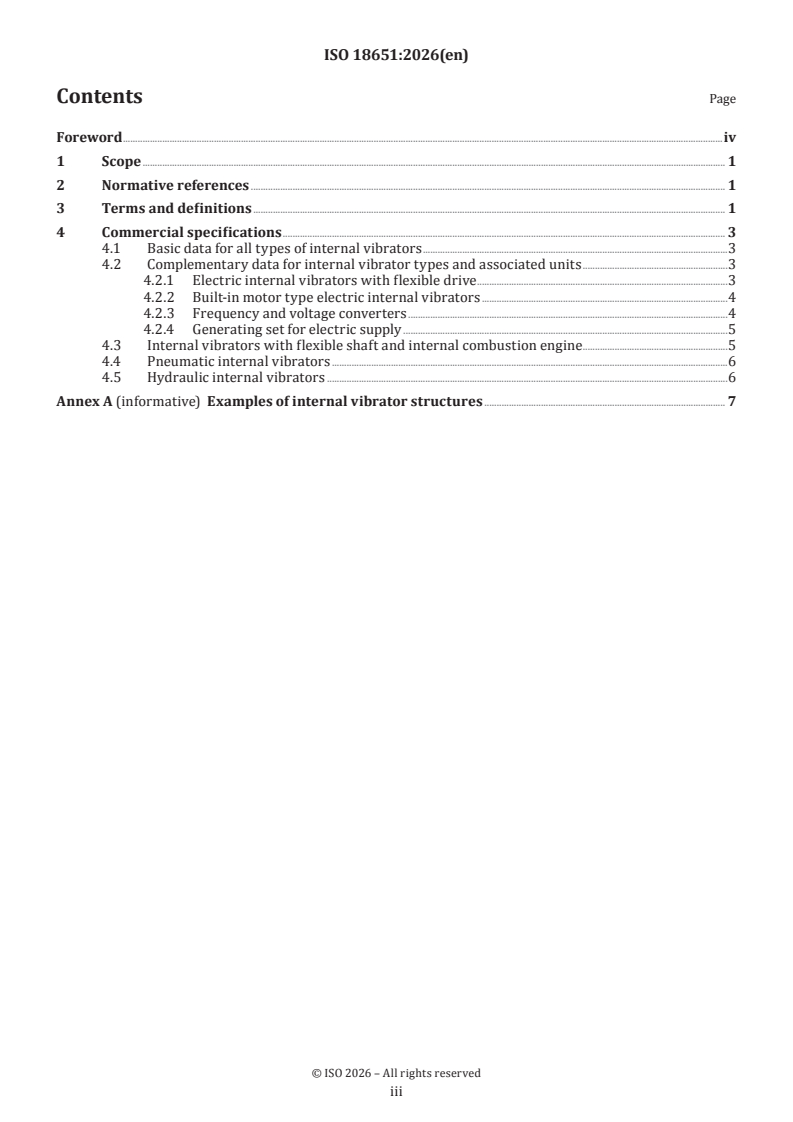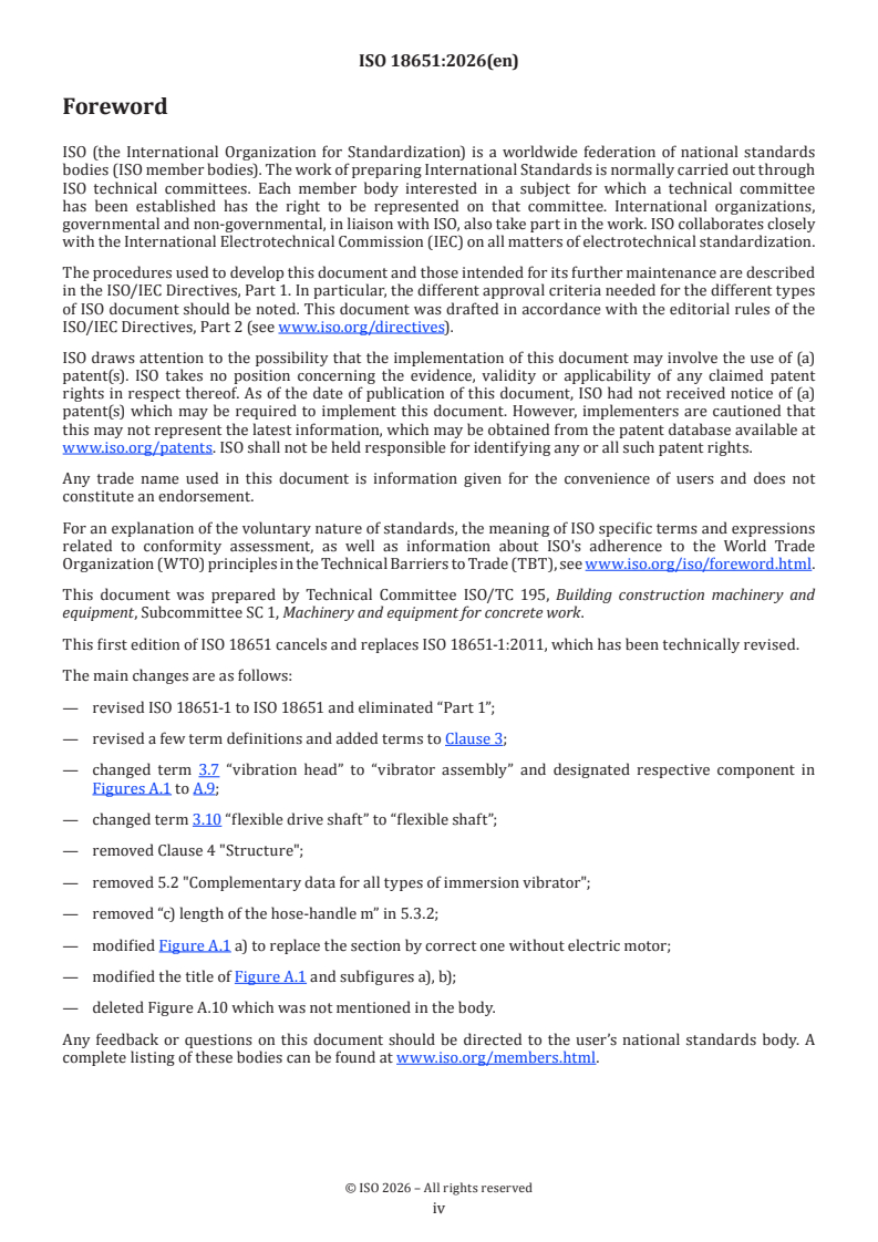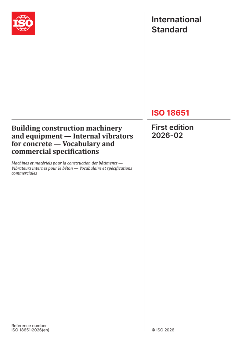 ISO 18651:2026 is a standard published by the International Organization for Standardization (ISO). Its full title is "Building construction machinery and equipment — Internal vibrators for concrete — Vocabulary and commercial specifications". This standard covers: This document defines vocabulary and provides commercial specifications for internal vibrators used for compacting uncured concrete mix.