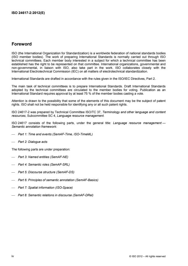 ISO 24617-2:2012 is a standard published by the International Organization for Standardization (ISO). Its full title is "Language resource management — Semantic annotation framework (SemAF) — Part 2: Dialogue acts". This standard covers: ISO 24617-2:2012 provides a set of empirically and theoretically well-motivated concepts for dialogue annotation, a formal language for expressing dialogue annotations -- the dialogue act markup language (DiAML) -- and a method for segmenting a dialogue into semantic units. This allows the manual or automatic annotation of dialogue segments with information about the communicative actions which the participants perform by their contributions to the dialogue. It supports multidimensional annotation, in which units in dialogue are viewed as having multiple communicative functions. The DiAML language has an XML-based representation format and a formal semantics which makes it possible to apply inference to DiAML representations. ISO 24617-2:2012 specifies data categories for reference sets of communicative functions and dimensions of dialogue analysis and provides principles and guidelines for extending these sets or selecting coherent subsets of them. Additionally, it provides guidelines for annotators and annotated examples. It is applicable to spoken, written and multimodal dialogues involving two or more participants.
