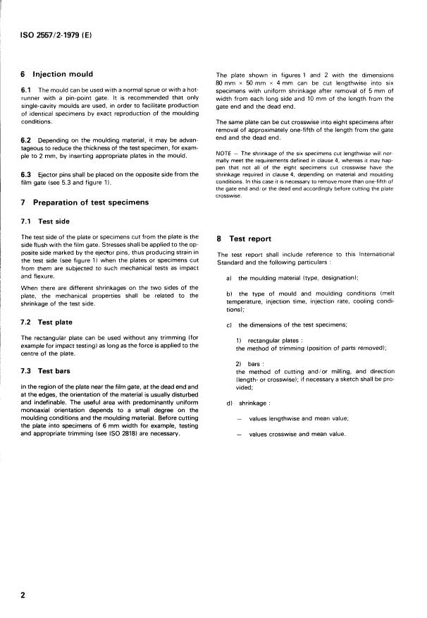 ISO 2557-2:1979 is a standard published by the International Organization for Standardization (ISO). Its full title is "Plastics — Amorphous thermoplastic moulding materials — Preparation of test specimens with a defined level of shrinkage — Part 2: Test specimens in the form of rectangular plates (Injection moulding)". This standard covers: Plastics — Amorphous thermoplastic moulding materials — Preparation of test specimens with a defined level of shrinkage — Part 2: Test specimens in the form of rectangular plates (Injection moulding)