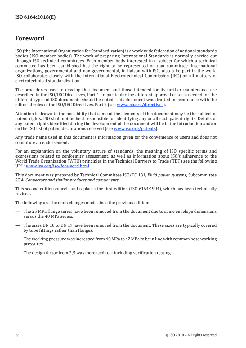 Keywords: ISO 6164:2018, hydraulic fluid power, four-screw flange, square flange connections, 42 MPa, DN 25–80, O-rings, flange clamp, flanged head, corrosion protection, pressure-temperature requirements.