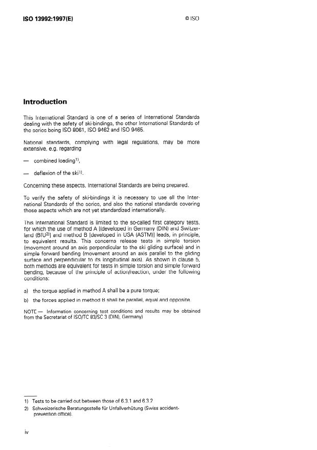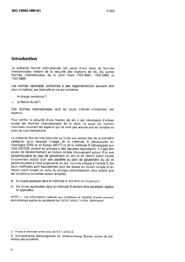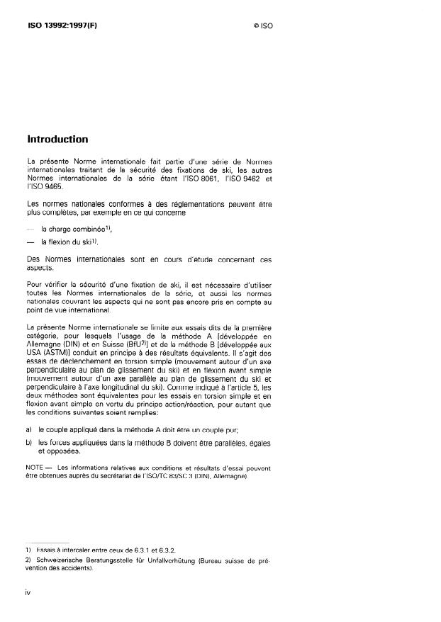 ISO 13992:1997 is a standard published by the International Organization for Standardization (ISO). Its full title is "Alpine touring ski-bindings — Safety requirements and test methods". This standard covers: La présente Norme internationale prescrit les caractéristiques principales des fixations de ski de randonnée et décrit, à titre d'exemple, les méthodes d'essai A et B. La présente Norme internationale s'applique en principe aux fixations utilisées dans la pratique du ski alpin de randonnée par les enfants, les adolescents et les adultes. Comme actuellement, il n'existe sur le marché ni chaussures ni fixations pour les enfants, la validité de la présente Norme internationale est, pour l'instant, limitée aux fixations pour adolescents et adultes.