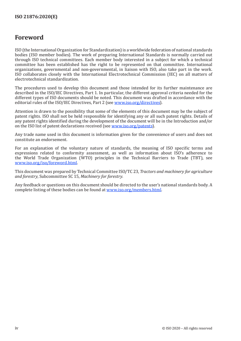 ISO 21876:2020 is a standard published by the International Organization for Standardization (ISO). Its full title is "Machinery for forestry - Saw chain shot protective windows - Test method and performance criteria". This standard covers: This document specifies a test method and corresponding performance requirements for saw chain shot protective windows on forestry machines equipped with a chain saw for cutting, harvesting or processing as defined in ISO 6814. It also applies to machines that have been modified to perform cutting, harvesting or processing (such as excavator) with a chain saw cutting attachment.