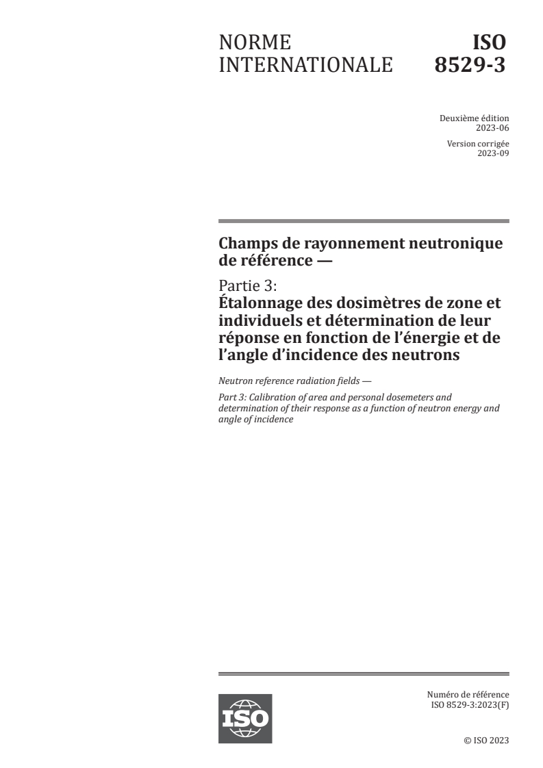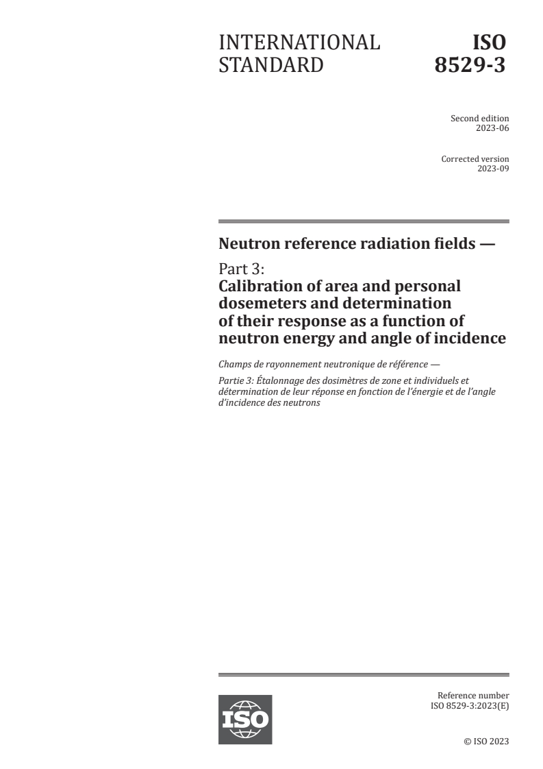 ISO 8529-3:2023 - Champs de rayonnement neutronique de référence — Partie 3: Étalonnage des dosimètres de zone et individuels et détermination de leur réponse en fonction de l’énergie et de l’angle d’incidence des neutrons Released:30. 06. 2023