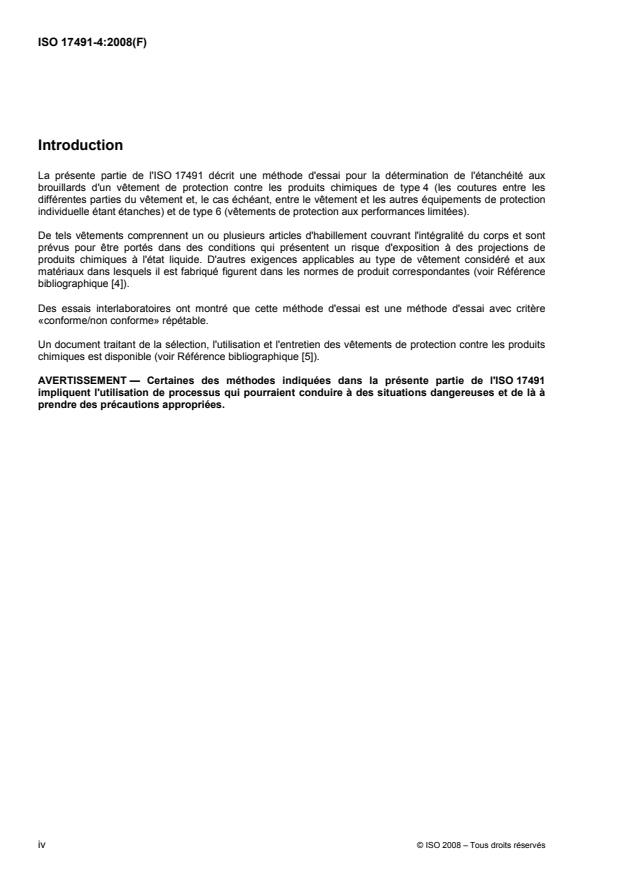L'ISO 17491-4:2008 spécifie les méthodes pour la détermination de la résistance des vêtements de protection à la pénétration par brouillard de produits chimiques liquides à deux niveaux différents d'intensité: Méthode A: essai au brouillard de faible intensité. L'essai au brouillard de faible niveau s'applique aux vêtements qui couvrent l'intégralité du corps, prévus pour être portés dans des conditions qui présentent un risque d'exposition à de faibles quantités d'un produit chimique liquide projetées sous forme d'un brouillard ou à des projections accidentelles de faibles volumes d'un produit chimique liquide. Méthode B: essai au brouillard d'intensité élevée. L'essai au brouillard de niveau élevé s'applique aux vêtements munis de coutures étanches au brouillard entre les différentes parties du vêtement et, le cas échéant, entre le vêtement et les autres équipements de protection individuelle, qui couvrent l'intégralité du corps et prévus pour être portés dans des conditions qui présentent un risque d'exposition à des particules de liquide pulvérisées.