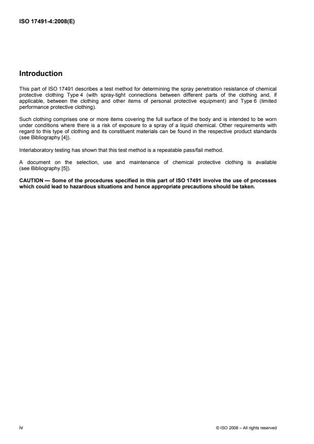 ISO 17491-4:2008 is a standard published by the International Organization for Standardization (ISO). Its full title is "Protective clothing — Test methods for clothing providing protection against chemicals — Part 4: Determination of resistance to penetration by a spray of liquid (spray test)". This standard covers: ISO 17491-4:2008 specifies methods for determining the resistance of chemical protective clothing to penetration by sprays of liquid chemicals at two different levels of intensity: Method A: low-level spray test. This is applicable to clothing that covers the full body surface and which is intended to be worn when there is a potential risk of exposure to small quantities of spray or accidental low volume splashes of a liquid chemical. Method B: high level spray test This is applicable to clothing with spray-tight connections between different parts of the clothing and, if applicable, between the clothing and other items of personal protective equipment, which covers the full body surface and which is intended to be worn when there is a risk of exposure to sprayed particles of liquid.