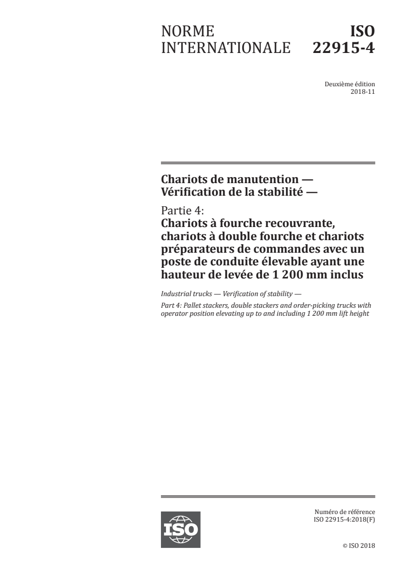 ISO 22915-4:2018 - Industrial trucks — Verification of stability — Part 4: Pallet stackers, double stackers and order-picking trucks with operator position elevating up to and including 1 200 mm lift height Released:10/29/2018