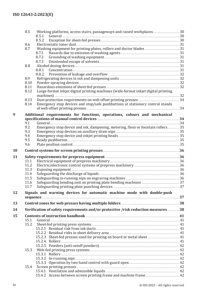 This document provides safety requirements specific to prepress and press equipment and systems. This document provides additional safety requirements for the design and construction of new prepress and press equipment, and the auxiliary equipment integrated into the press control system. This document is not applicable to prepress and press equipment and systems manufactured before the date of its publication.
