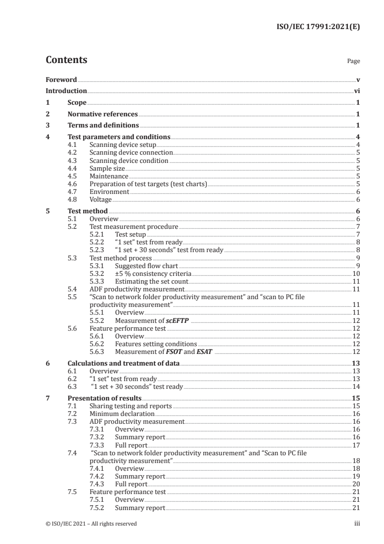 ISO/IEC 17991:2021 - Information technology - Office equipment - Method for measuring scanning productivity of digital scanning devices defines a standardized method to measure and report the productivity of digital scanners. The standard specifies procedures to measure scanning speed, scan to network folder speed, and scan to PC speed, including test files, test targets (test charts), test setup, execution steps and reporting requirements. It applies to A4/letter-capable devices with an automatic document feeder (ADF): multi‑function devices, networked scanners and single‑function scanners. It explicitly excludes measurements for scan-to-USB or local hard-drive targets and is not intended for image‑quality assessment or document management.