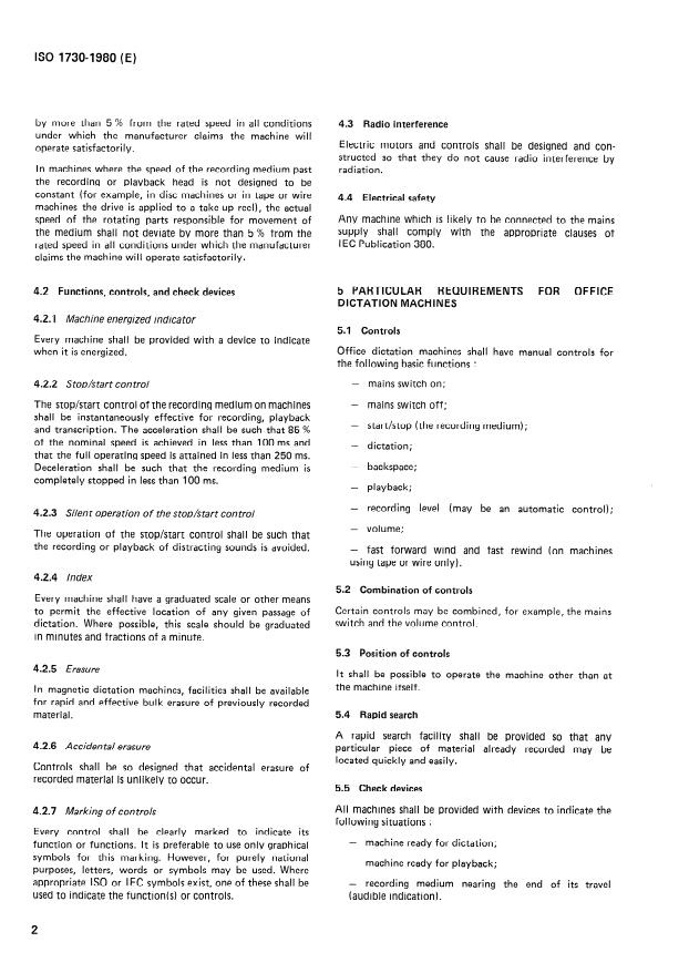 Keywords: ISO 1730:1980, dictation equipment, transcription machines, office dictation machines, portable dictation, centralized dictation system, operating requirements, recording duration, speed stability, controls and indicators, electrical safety, radio interference, standardized dictation equipment, transcription workflow, office machines standards.