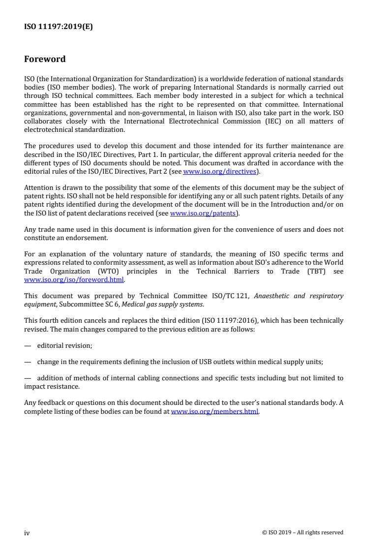 ISO 11197:2019 is a standard published by the International Organization for Standardization (ISO). Its full title is "Medical supply units". This standard covers: IEC 60601-1:2005+A1:2012, 1.1 is replaced by: This document applies to the basic safety and essential performance of medical supply units, hereafter also referred to as ME equipment. This document applies to medical supply units manufactured within a factory or assembled on site, including cabinetry and other enclosures, which incorporate patient care services. NOTE 1 A party that assembles on site various components intended for patient care services into an enclosure is considered the manufacturer of the medical supply unit. Hazards inherent in the intended function of ME equipment or ME systems within the scope of this document are not covered by specific requirements in this standard, except in of IEC 60601-1:2005+A1:2012, 7.2.13 and 8.4.1 (see 201.1.4). NOTE 2 Refer to IEC 60601-1:2005+A1:2012, 4.2.