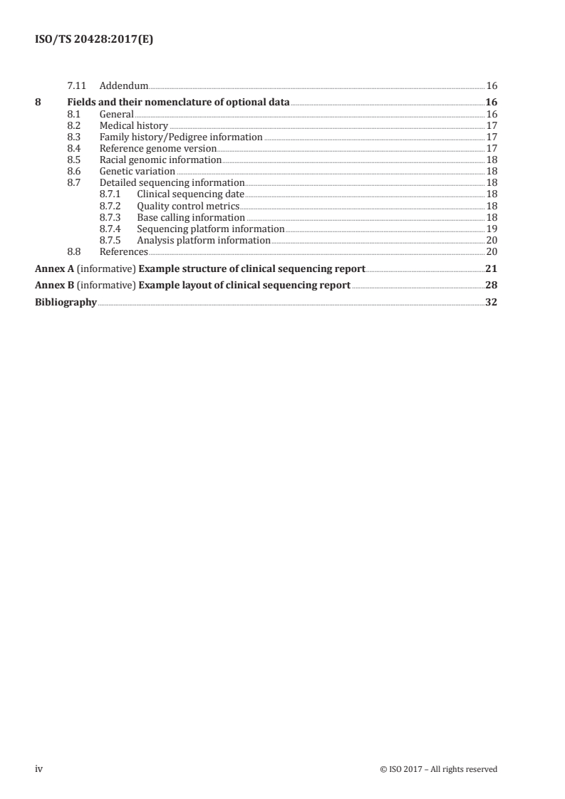 ISO/TS 20428:2017 is a technical specification published by the International Organization for Standardization (ISO). Its full title is "Health informatics - Data elements and their metadata for describing structured clinical genomic sequence information in electronic health records". This standard covers: ISO/TS 20428:2017 defines the data elements and their necessary metadata to implement a structured clinical genomic sequencing report and their metadata in electronic health records particularly focusing on the genomic data generated by next generation sequencing technology. ISO/TS 20428:2017 - defines the composition of a structured clinical sequencing report (see Clause 5), - defines the required data fields and their metadata for a structured clinical sequencing report (see Clause 6), - defines the optional data (see Clause 7), - covers the DNA-level variation from human samples using whole genome sequencing, whole exome sequencing, and targeted sequencing (disease-targeted gene panels) by next generation sequencing technologies. Though whole transcriptome sequencing and other technologies are important to provide better patient care and enable precision medicine, this document only deals with DNA-level changes, - covers mainly clinical applications and clinical research such as clinical trials and translational research which uses clinical data. However, the necessary steps such as de-identification or consent from patient should be applied. The basic research and other scientific areas are outside the scope of this document, - does not cover the other biological species, i.e. genomes of viruses and microbes, and - does not cover the Sanger sequencing methods.