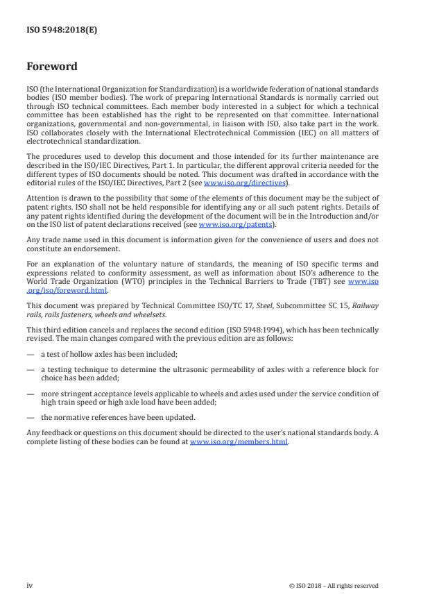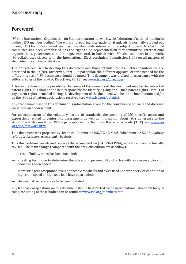 ISO 5948:2018 is a standard published by the International Organization for Standardization (ISO). Its full title is "Railway rolling stock material — Ultrasonic acceptance testing". This standard covers: This document specifies the test conditions and the acceptance levels for ultrasonic acceptance tests for the railway rolling stock material, such as tyres, axles and wheels. Unless otherwise agreed, this document is applied when the product standards require mandatory ultrasonic tests or when the ordered optional tests are made mandatory (see ISO 1005-1, ISO 1005-3 and ISO 1005-6).