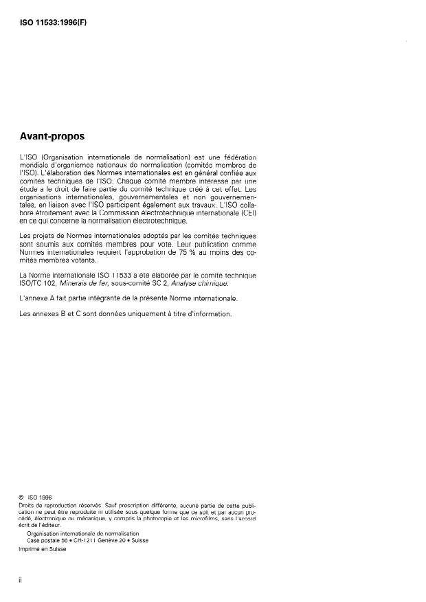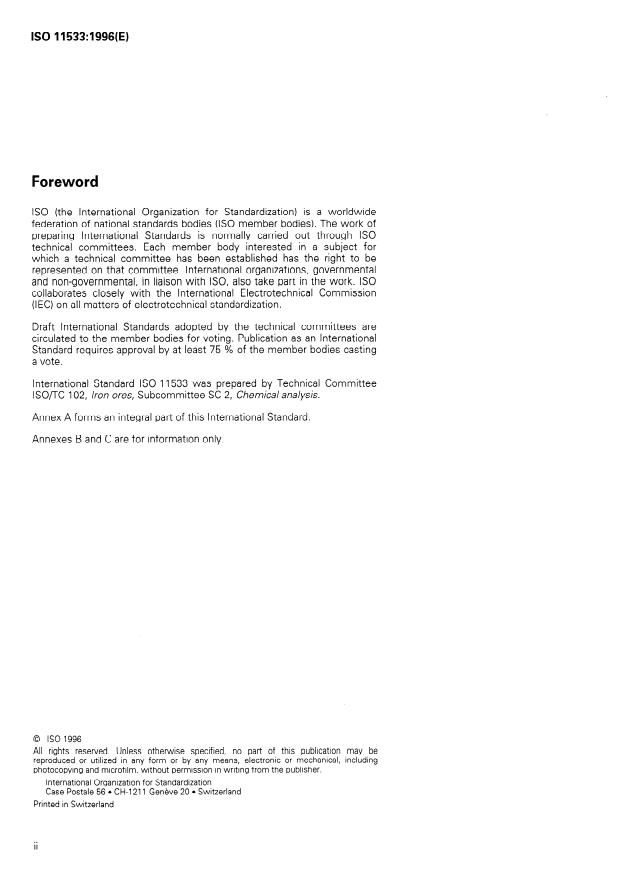 ISO 11533:1996 is a standard published by the International Organization for Standardization (ISO). Its full title is "Iron ores — Determination of cobalt content — Flame atomic absorption spectrometric method". This standard covers: Specifies a flame atomic absorption spectrometric method for the determination of the cobalt content of iron ores. This method is applicable to a concentration range of 0,000 6 % (m/m) to 0,070 0 % (m/m) of cobalt in natural iron ores, iron ore concentrates and agglomerates, including sinter products.