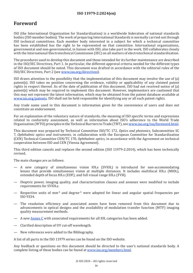 ISO 11979-2:2024 is a standard published by the International Organization for Standardization (ISO). Its full title is "Ophthalmic implants - Intraocular lenses - Part 2: Optical properties and test methods". This standard covers: This document specifies requirements and test methods for certain optical properties of intraocular lenses (IOLs) with monofocal, toric, simultaneous vision, and/or accommodative optics. The generic descriptor ‘IOL’ used throughout this document also includes phakic intraocular lenses (PIOL).