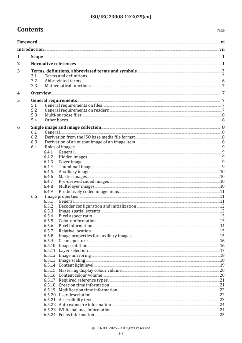 ISO/IEC 23008-12:2025 is a standard published by the International Organization for Standardization (ISO). Its full title is "Information technology - High efficiency coding and media delivery in heterogeneous environments - Part 12: Image File Format". This standard covers: This document specifies the Image File Format, an interoperable storage format for a single image, a collection of images, and sequences of images. The format defined in this document is built on tools defined in ISO/IEC 14496-12 and enables the interchange, editing, and display of images, as well as the carriage of metadata associated with those images. The Image File Format defines structures used to contain metadata, how to link that metadata to the images, and defines how metadata of certain forms is carried. This document also specifies brands for the storage of images and image sequences conforming to High Efficiency Video Coding (HEVC), Advanced Video Coding (AVC), JPEG, Versatile Video Coding (VVC) and Essential Video Coding (EVC). NOTE The storage of HEVC, AVC, VVC and EVC video sequences is out of scope and is provided in ISO/IEC 14496-15.