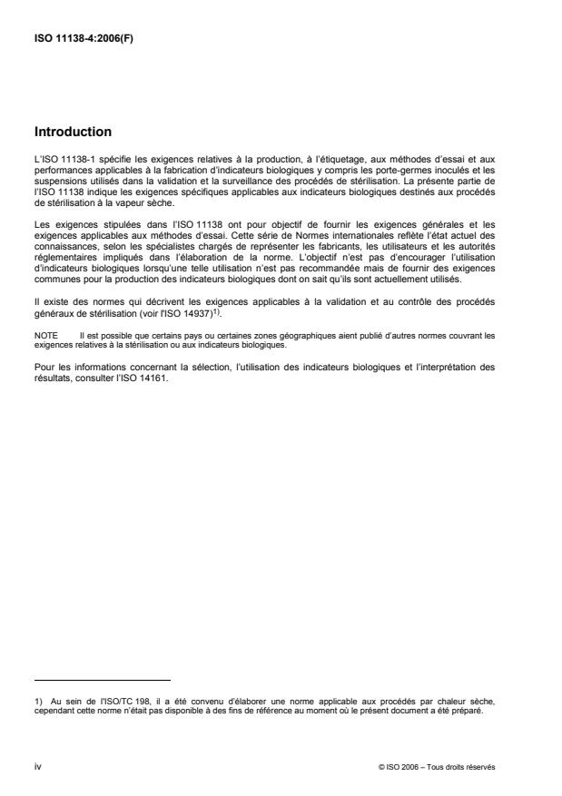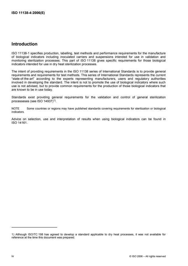 ISO 11138-4:2006 is a standard published by the International Organization for Standardization (ISO). Its full title is "Sterilization of health care products — Biological indicators — Part 4: Biological indicators for dry heat sterilization processes". This standard covers: ISO 11138-4:2006 provides specific requirements for test organisms, suspensions, inoculated carriers, biological indicators, and test methods intended for use in assessing the performance of sterilization processes employing dry heat as the sterilizing agent at sterilizing temperatures within the range of 120 °C to 180 °C.