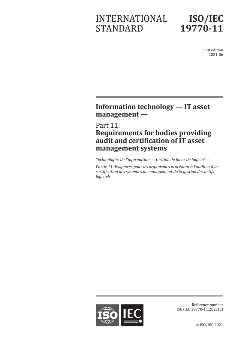 ISO/IEC 19770-11:2021 - Information technology — IT asset management — Part 11: Requirements for bodies providing audit and certification of IT asset management systems Released:6/8/2021