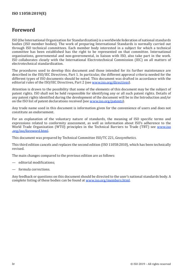ISO 11058:2019 is a standard published by the International Organization for Standardization (ISO). Its full title is "Geotextiles and geotextile-related products — Determination of water permeability characteristics normal to the plane, without load". This standard covers: This document specifies two test methods for determining the water permeability characteristics of a single layer of geotextile or geotextile-related product normal to the plane: a) the constant head method; and b) the falling head method.