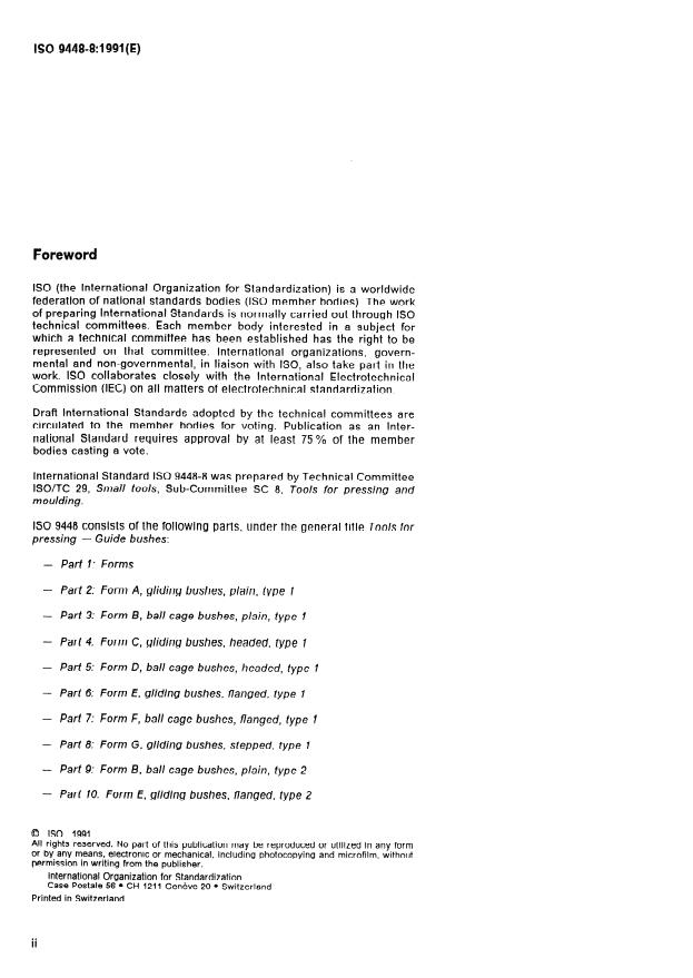 ISO 9448-8:1991 is a standard published by the International Organization for Standardization (ISO). Its full title is "Tools for pressing — Guide bushes — Part 8: Form G, gliding bushes, stepped, type 1". This standard covers: Specifies the main dimensions and tolerances, as well as the hardness and the designation of bushes. Gives guidance on the materials. Details not stated are left to the manufacturer's discretion. Annex A is for information only.