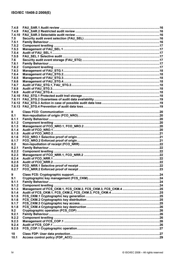 ISO/IEC 15408-2:2008 is a standard published by the International Organization for Standardization (ISO). Its full title is "Information technology — Security techniques — Evaluation criteria for IT security — Part 2: Security functional components". This standard covers: ISO/IEC 15408-2:2008 defines the content and presentation of the security functional requirements to be assessed in a security evaluation using ISO/IEC 15408. It contains a comprehensive catalogue of predefined security functional components that will meet most common security needs of the marketplace. These are organized using a hierarchical structure of classes, families and components, and supported by comprehensive user notes. ISO/IEC 15408-2:2008 also provides guidance on the specification of customized security requirements where no suitable predefined security functional components exist.