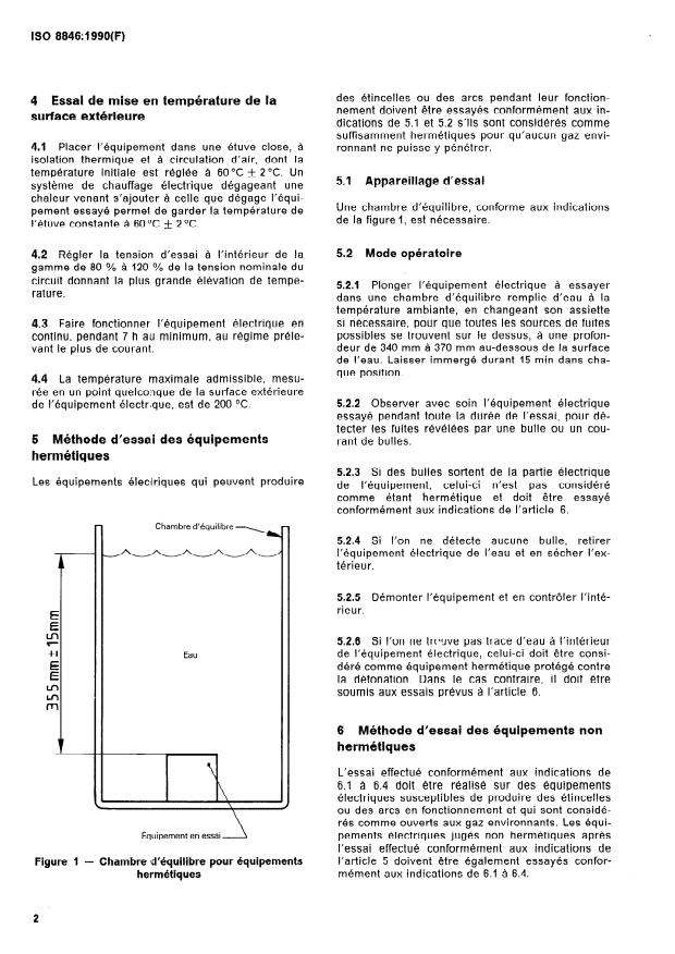 ISO 8846:1990 - "Small craft - Electrical devices - Protection against ignition of surrounding flammable gases" specifies test methods and design requirements for electrical equipment used on small craft so that they can be operated in potentially explosive atmospheres without igniting surrounding flammable hydrocarbon gases. The standard targets devices that may produce sparks, arcs or hot surfaces and defines test procedures for both sealed and non-sealed assemblies. It does not require explosion-proof enclosures (as per IEC 79-0) and does not cover hydrogen/air mixtures or external ignition sources such as lightning or static.