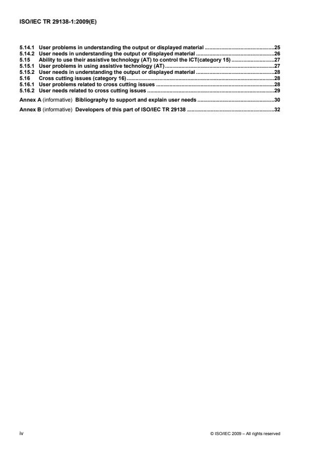 ISO/IEC TR 29138-1:2009 identifies a collection of user needs of people with disabilities for standards developers to take into consideration when developing or revising their standards. These user needs are also useful for developers of information technology products and services and for accessibility advocates to consider. In addition to identifying user needs, ISO/IEC TR 29138-1:2009 identifies problems that people with disabilities experience with information technologies that lead to these user needs and identifies the relationship of these user needs with the accessibility factors for standards developers to consider found in ISO/IEC Guide 71: Guidelines to address the needs of older persons and people with disabilities when developing standards.