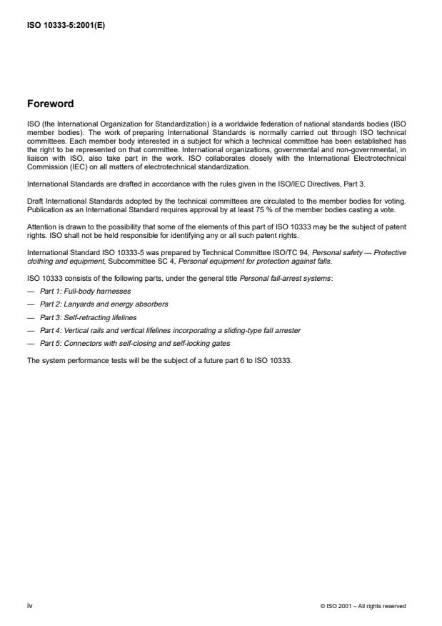 ISO 10333-5:2001 is a standard published by the International Organization for Standardization (ISO). Its full title is "Personal fall-arrest systems — Part 5: Connectors with self-closing and self-locking gates". This standard covers: This part of ISO 10333 specifies requirements, test methods, instructions for use and maintenance, marking, labelling and packaging, as appropriate, for connectors with self-closing and self-locking gates made from metallic materials. Connectors are used in personal fall-arrest systems (PFAS), which will be specified in a future International Standard (see ISO 10333-6 in the Bibliography), such that, if an arrest takes place, the arresting force will not exceed 6kN.. This part of ISO 10333 is applicable only to connectors limited to single person use of a total mass not exceeding 100kg. . NOTE Users of fall protection equipment whose total mass (including tools and equipment) exceeds 100 kg are advised to seek advice from the equipment manufacturer regarding the suitability of this equipment, which may need additional testing. The scope of this part of ISO 10333 does not extend to: a) attachment elements, fastening buckles, adjusting buckles and other metallic fittings used in the manufacture of full-body harnesses, which are specified in ISO 10333-6; b) connectors used for material-lifting purposes; c) connectors used in special techniques or situations, e.g. rescue, or rope access. This part of ISO 10333 does not specify those additional requirements that would apply when connectors are subjected to special conditions of use (where, for example, there exist unusual limitations concerning access to the place of work and/or particular environmental factors). Thus, treatments to ensure the durability of the materials of construction (such as heat treatment, anti-corrosion treatment, protection against physical and chemical hazards) are not specified in this part of ISO 10333, but should comply with appropriate International Standards or, failing that, with national standards and other specifications dealing with relevant physical characteristics and/or the safety of users. In particular, when it is considered necessary to test the corrosion resistance of metallic parts of the equipment, reference should be made to ISO 9227.