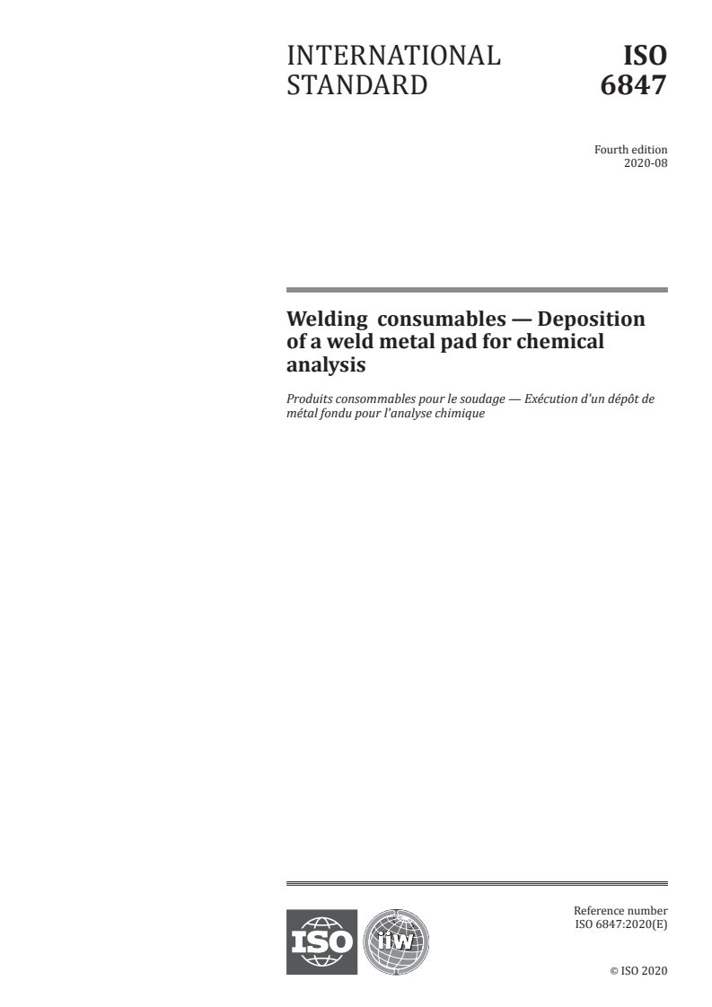 ISO 6847:2020 - Welding consumables — Deposition of a weld metal pad for chemical analysis Released:8/21/2020