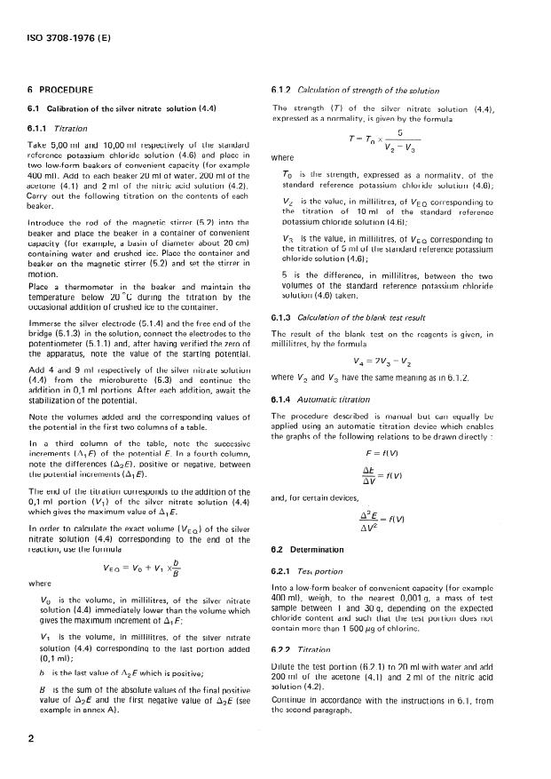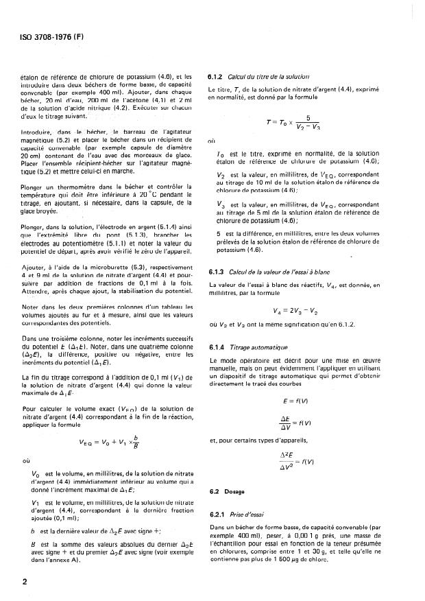 ISO 3708:1976 is a standard published by the International Organization for Standardization (ISO). Its full title is "Phosphoric acid for industrial use (including foodstuffs) — Determination of chloride content — Potentiometric method". This standard covers: Applicable to products having Cl- contents, expressed as chlorine, equal to or more than 0.001 % (m/m). The lower limit can be extended downwards by using weaker standard reference and volumetric solutions. Describes potentiometric titration of the ions with silver nitrate solution in a nitric acid-acetone-water medium using a silver measurement electrode and a calomel reference electrode.