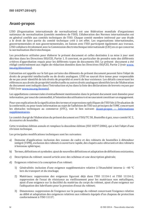 L'ISO 10297:2014 spécifie la conception, les méthodes d'essai de type et les exigences de marquage pour: a) les robinets de bouteilles destinés à être montés sur des bouteilles à gaz transportables rechargeables; b) les vannes de cadre (à l'exception des robinets à boisseau sphérique) pour cadres de bouteilles; c) les robinets de bouteilles ou vannes de cadre à régulateur intégré (VIPR); qui acheminent des gaz comprimés, liquéfiés ou dissous. L'ISO 10297:2014 couvre la fonction d'un robinet en tant que dispositif de fermeture. Elle ne s'applique pas aux robinets pour équipement cryogénique, extincteurs portables et gaz de pétrole liquéfié (GPL) et aux robinets à ouverture rapide (par exemple, pour extinction d'incendie, protection contre l'explosion et opérations de sauvetage), aux clapets anti-retour ou aux robinets à boisseau sphérique.