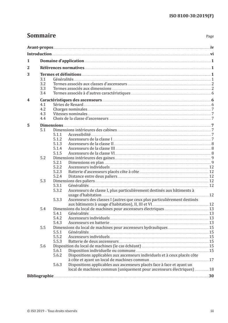 ISO 8100-30:2019 - “Lifts for the transport of persons and goods - Part 30: Class I, II, III and VI lifts installation” specifies the necessary dimensional requirements to permit the installation of passenger lifts of Class I, II, III and VI. It applies to new lift installations (including car with one entrance), regardless of drive system, and where relevant to existing buildings. The standard excludes lifts with rated speed greater than 6.0 m/s. A corrected version was issued in 2020.