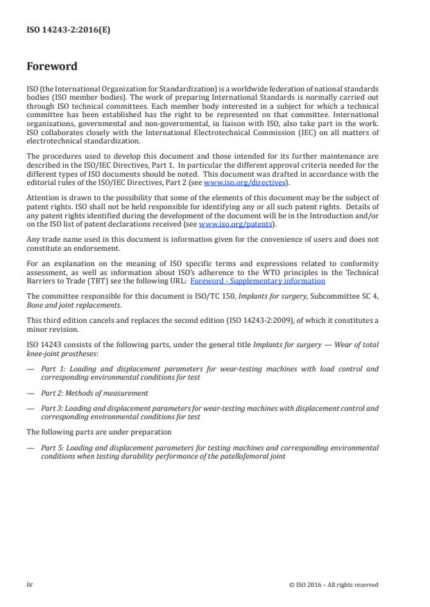 ISO 14243-2:2016 is a standard published by the International Organization for Standardization (ISO). Its full title is "Implants for surgery — Wear of total knee-joint prostheses — Part 2: Methods of measurement". This standard covers: ISO 14243-2:2016 specifies a method of assessment of wear of the tibial component of total knee-joint prostheses using the gravimetric technique for components tested in accordance with ISO 14243‑1 or ISO 14243‑3 as appropriate.
