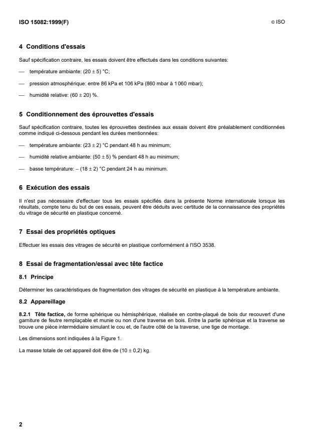 ISO 15082:1999 is a standard published by the International Organization for Standardization (ISO). Its full title is "Road vehicles — Tests for rigid plastic safety glazing materials". This standard covers: La présente Norme internationale spécifie toutes les méthodes d'essai relatives aux exigences de sécurité des vitrages de sécurité en plastique rigide d'un véhicule routier, quel que soit le type de plastique qui les compose. NOTE Les vitrages de sécurité en plastique sont qualifiés de «rigides» ou «flexibles» selon les résultats de l'essai décrit dans l'annexe A.