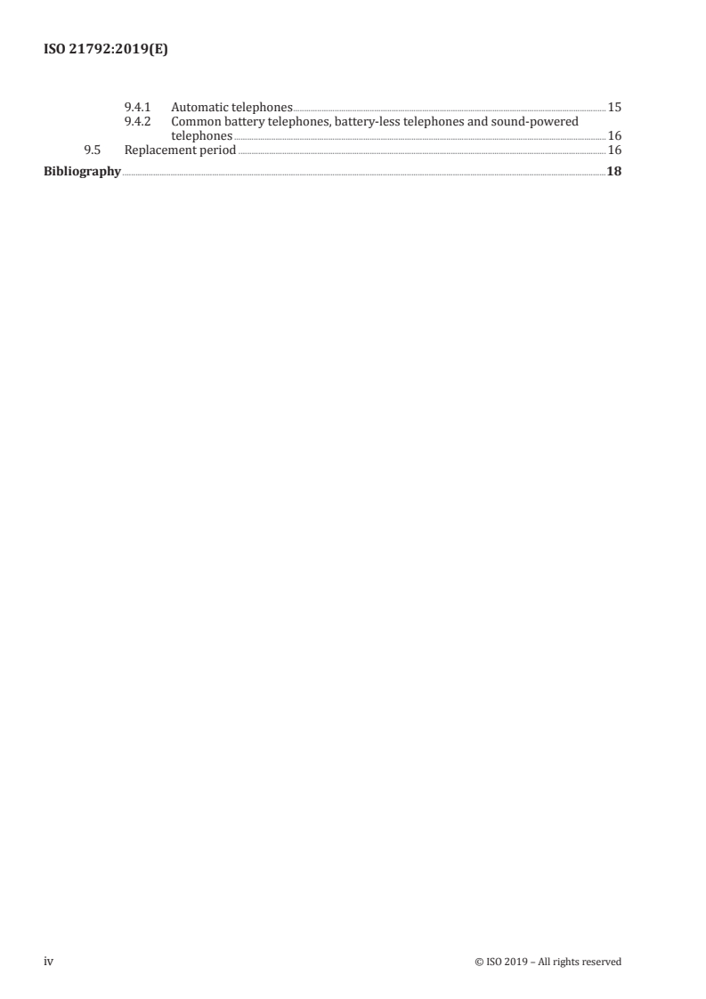 ISO 21792:2019 is a standard published by the International Organization for Standardization (ISO). Its full title is "Ships and marine technology — Navigation and ship operations — Guidelines for onboard telephone equipment". This standard covers: This document provides general and specific recommendations related to the quality of communication, connectivity, installation, performance and maintenance of onboard telephone equipment, including automatic telephones, common battery telephones, battery-less telephones and sound-powered telephones. It also specifies requirements for the related performance tests (shop tests and onsite tests) and for the maintenance tests. It is not applicable to digital telephones, LAN (VoIP) telephones, and wireless telephones. NOTE These telephones are excluded because they were under development during the elaboration of this document so that their specifications remained to be determined.
