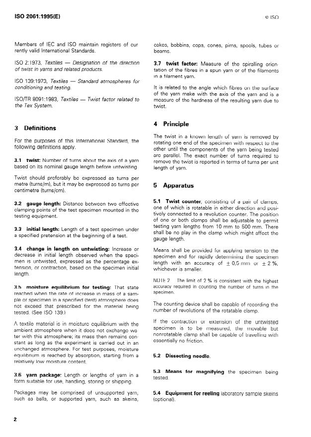 ISO 2061:1995 is a standard published by the International Organization for Standardization (ISO). Its full title is "Textiles — Determination of twist in yarns — Direct counting method". This standard covers: Specifies a method for the determination of the direction of twist in yarns, the amount of twist, in terms of turns per unit length, and the change in length on untwisting, by the direct counting method. Applicable to single, folded and cabled yarns. Replaces the first edition, which has been technically revised.