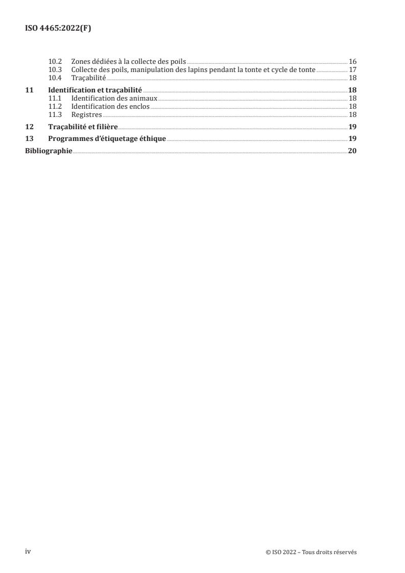 Le présent document spécifie les exigences de gestion des élevages de lapins angoras conformément aux principes de bien-être animal. Le présent document s’applique à la gestion et au contrôle des activités essentielles de l’élevage de lapins angoras, y compris le logement, la reproduction, l’alimentation et les nutriments, la santé, la collecte des fibres, les déclarations éthiques et les informations justificatives.